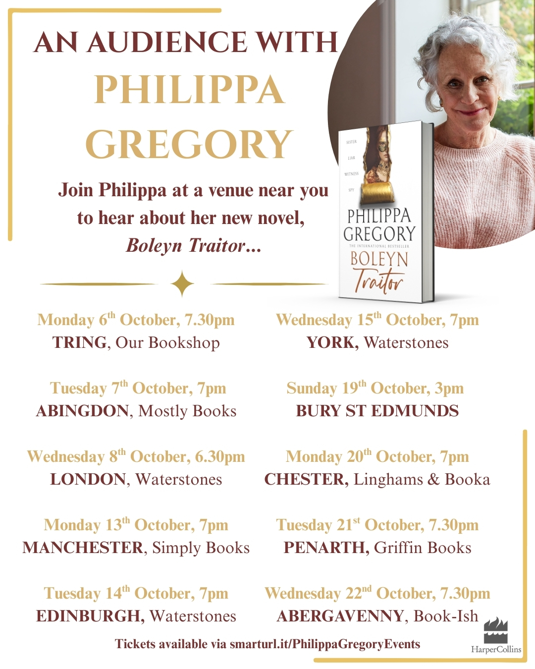 Hope to meet some of you on the road! I'm sorry I can't be everywhere. Here's the link for tickets and info https://smarturl.it/PhilippaGregoryEvents